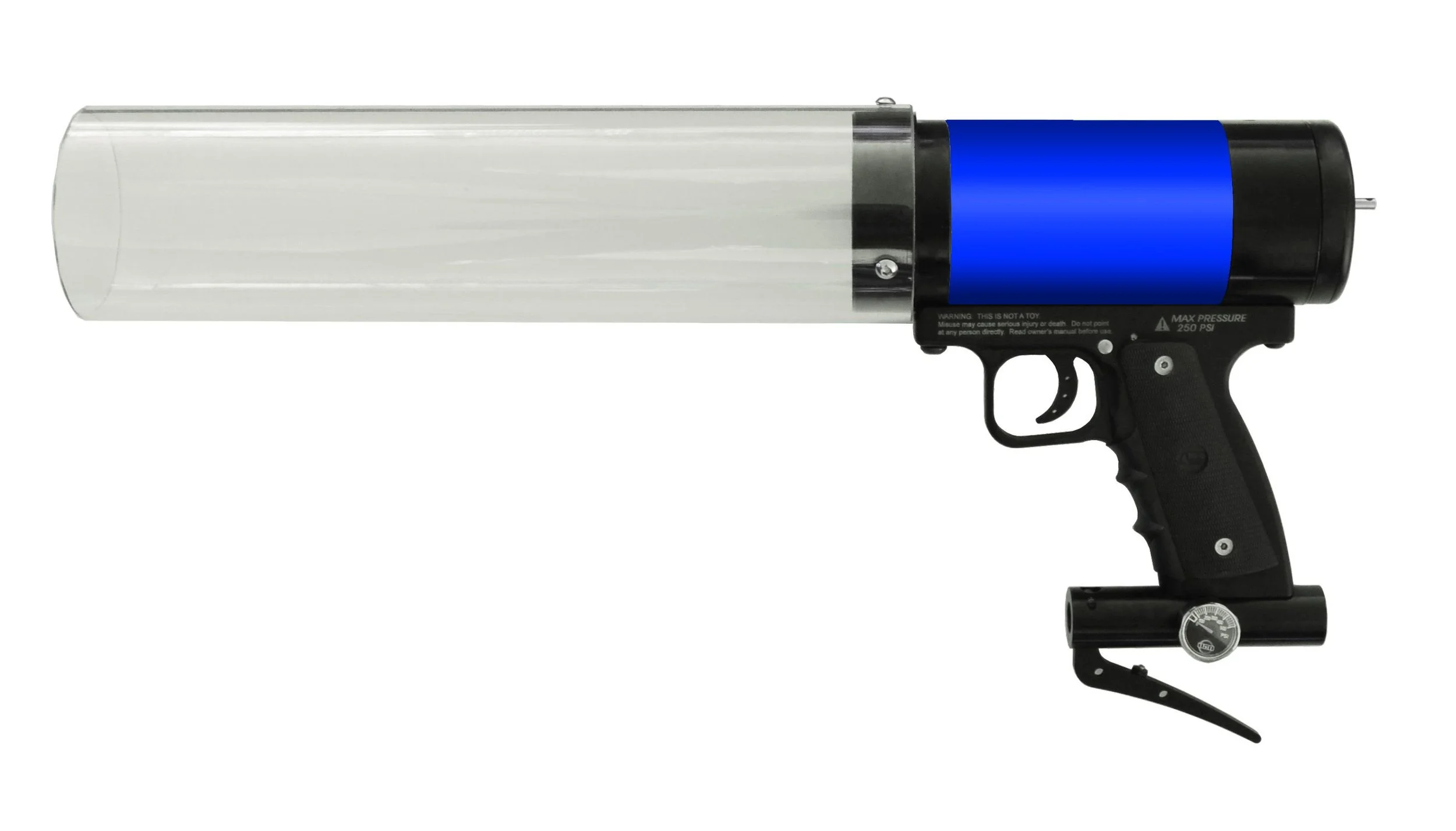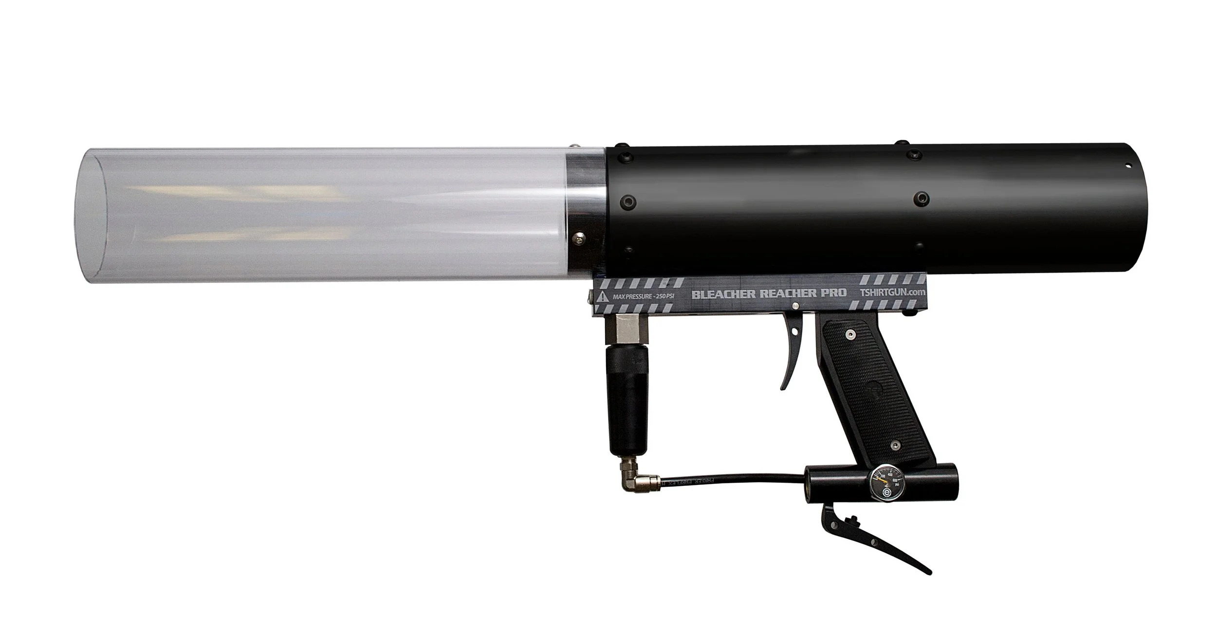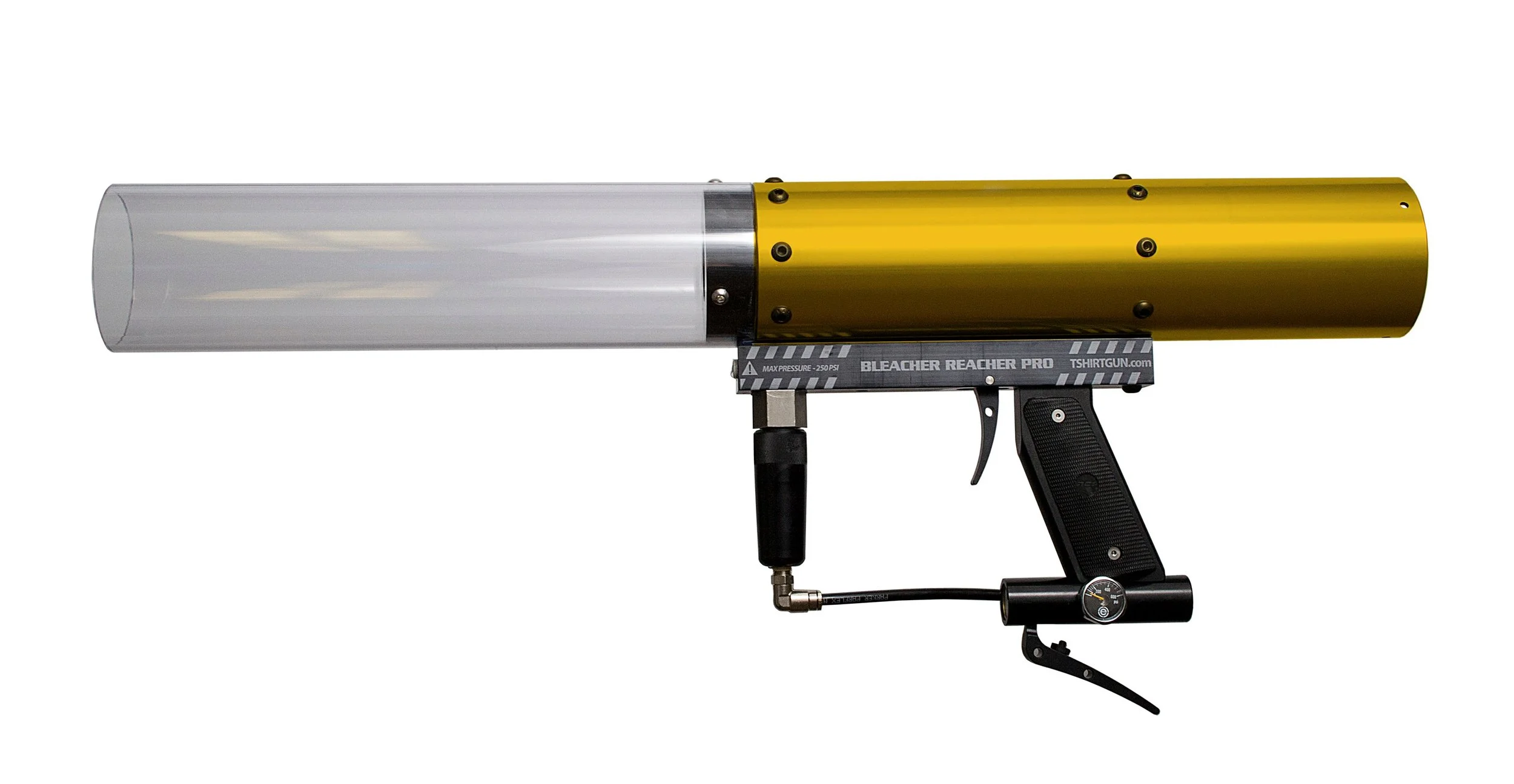 THE PRO CANNON is the mid sized hand-held launcher. At just under 7lbs, it shoots to the top deck of most arenas and stadiums. Variable range of (10-250 ft), built-in regulator, pneumatic trigger, real-time velocity control gauge and large bazooka style lexan barrel. It can also be customized to accommodate launching larger promotional items.